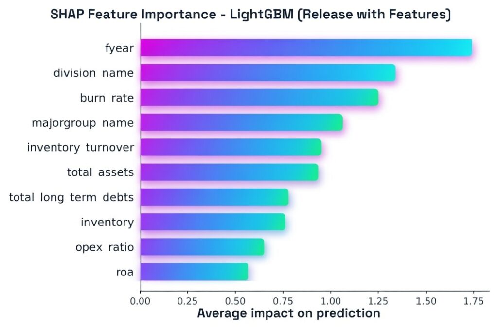 Langfristige Verbindlichkeiten, EBIT, EBITDA, Gesamtumsatz und Umlaufvermögen rangieren im SHAP-Top-10, jedoch hinter akkumulierter Resilienz, Konjunkturzeitpunkt und makrosektoraler Exposition. Diese Kennzahlen behalten ihre Relevanz, ihre prognostische Aussagekraft wird jedoch maßgeblich durch das Niveau einbehaltener Gewinne und das makrosektorale Umfeld moduliert.